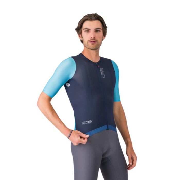 • Tessuto traspirante e aerodinamico su corpo e maniche