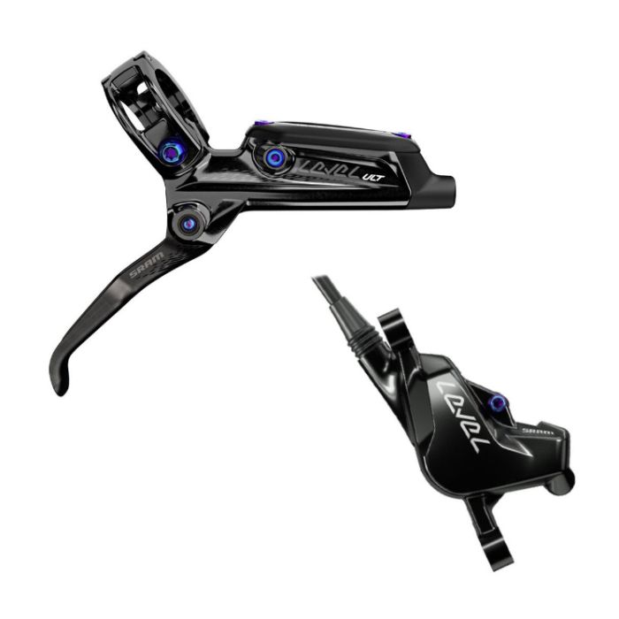 Impianto frenante MTB Level ultimate Rainbow. Un freno destinato alle gare, specifico per chi cera un ottima potenza e massima leggerezza. leve in carbonio, con pinze a 2 pistoncini ben potenti, pastiglie incluse con una nuova mescola sinterizzata che garantisce un ottima frenata anche in condizioni di bagnato. Impianto frenante gia pronto all'uso. Ideale per un uso XC - Trail.